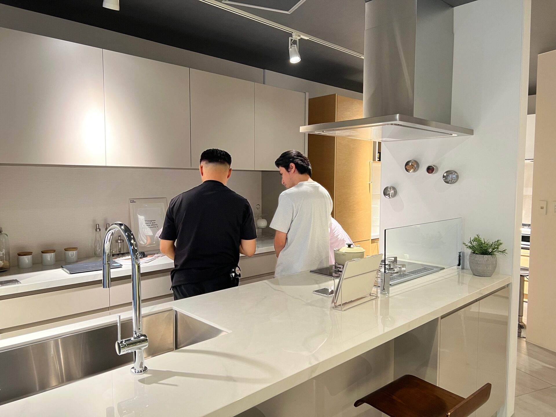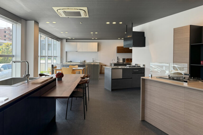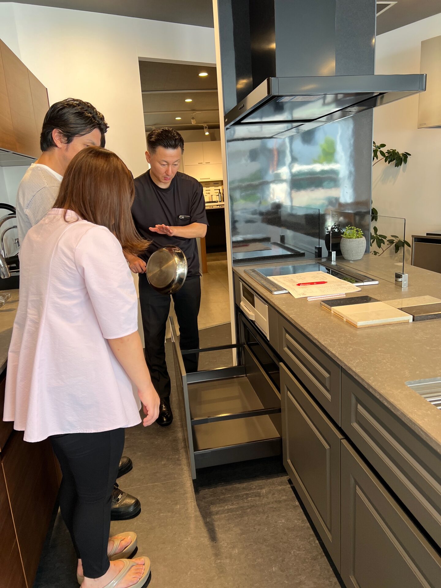 ショールームに入ると、ずらりと並んだ美しいキッチンに、お施主様のテンションも一気に上がります。「こんなキッチンにしたい!」という理想のイメージを共有していただきながら、素材や色、そして細かな仕様を一つひとつ丁寧に決めていきました。